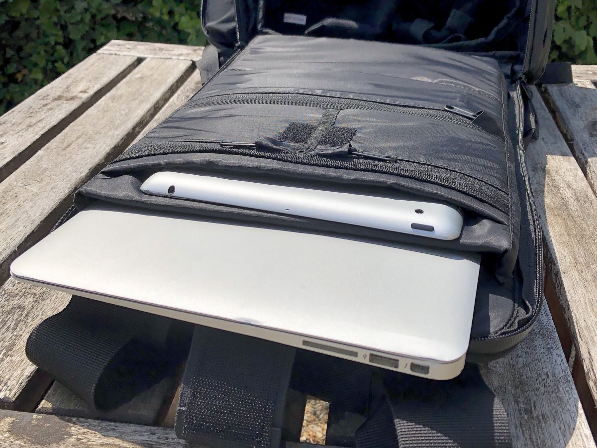 Inside, the main flap has two small zippered pockets, a wider zippered pocket, and the laptop and tablet sections. These last two are held closed by a substantial Velcro-fixed flap.